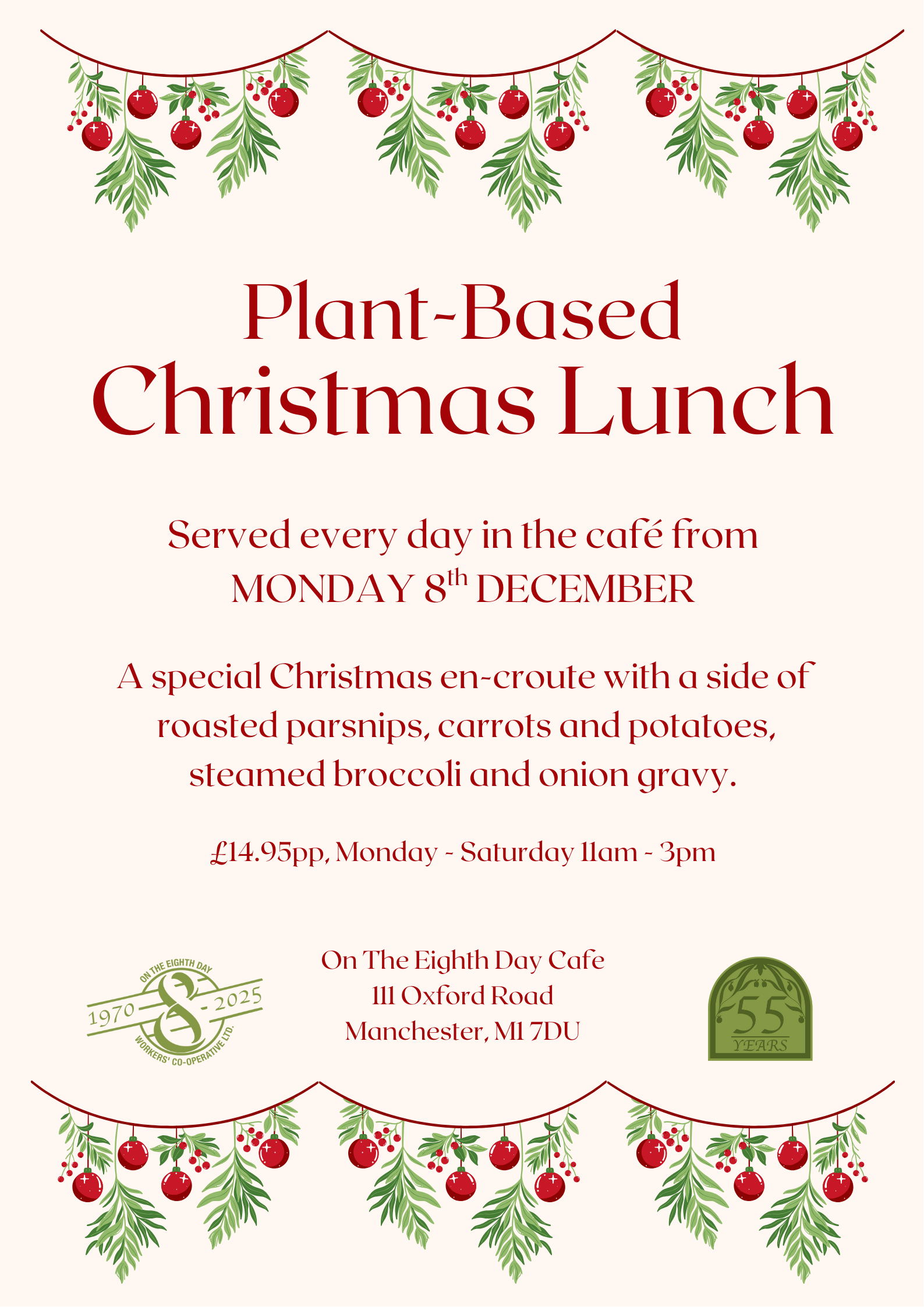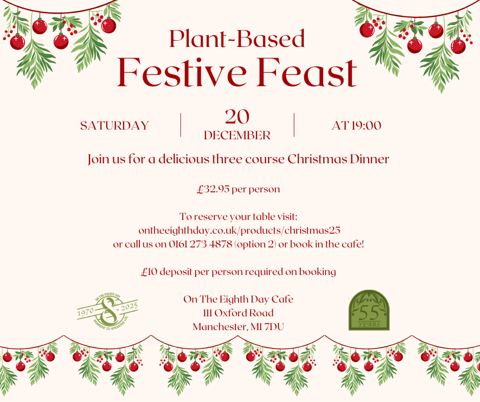 Join us in the Eighth Day café at 7pm on Saturday the 20th of December for a three course meal of plant-based Christmas delights. This event is only available on a pre-booked…